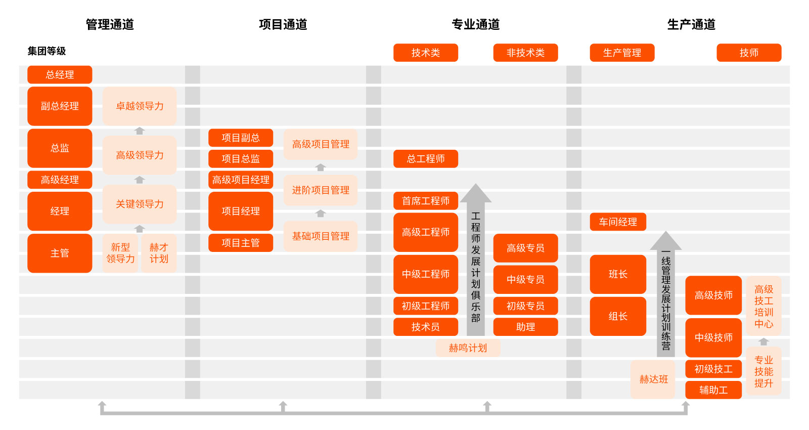 • 通過管理、項目、專業(yè)和生產四個通道的人才發(fā)展體系,實施不同類別、不同層次的人才發(fā)展項目,實現(xiàn)公司在人才挑選、培養(yǎng)、發(fā)展、使用和保留等關鍵環(huán)節(jié)的全面提升